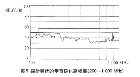 本開關電源一次通過了傳導騷擾的測試,測試波形如圖2、3所示。輻射騷擾高頻段230~1000MHz也測試合格,如圖5所示。只是在30~200MHz頻段范圍內的垂直極化指標超標,最大超標20dB,如圖4所示。