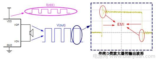 傳統(tǒng)D類放大器開關(guān)輸出的拓?fù)浣Y(jié)構(gòu)是一個(gè)很好的EMI發(fā)射源:如調(diào)制的開關(guān)信號,開關(guān)信號的邊沿變化,電源線上變化的電流信號等都會產(chǎn)生大量的EMI,如下圖所示。