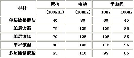 電子設(shè)備采用金屬平板做機箱,既堅固耐用,又具有電磁屏蔽作用。其電磁屏蔽效能與金屬平板材料性質(zhì)、電磁場源性質(zhì)、電磁場源與金屬平板的距離、屏蔽體接地狀況等參數(shù)有關(guān)。各種金屬屏蔽材料的性能見表2。