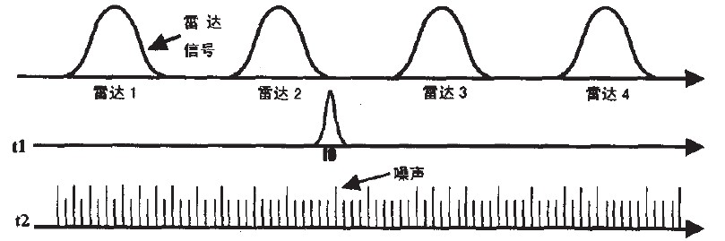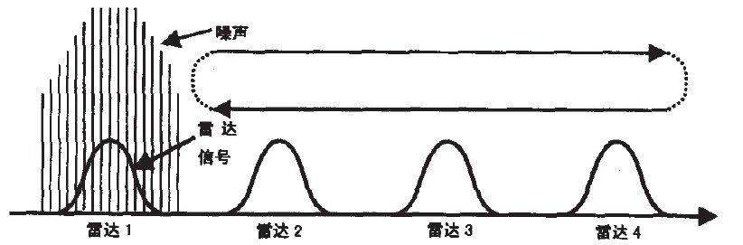 掃頻干擾方式主要在雷達的整個調(diào)諧頻帶內(nèi)重復(fù)進行點干擾,雖然此方式不能比寬帶噪聲干擾給出更多的平均功率,但是掃頻干擾使每個雷達周期性地承擔(dān)最大可能的功率。事實證明,通過調(diào)整掃描頻率以保持雷達通帶內(nèi)的干擾時間約等于雷達發(fā)射脈沖寬度,掃頻干擾方式在產(chǎn)生假目標(biāo)方面是最有效的。并且對于掃描雷達,掃頻干擾可產(chǎn)生足夠可信賴的假目標(biāo)。其工作方式如圖3所示。
