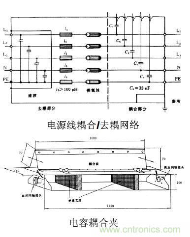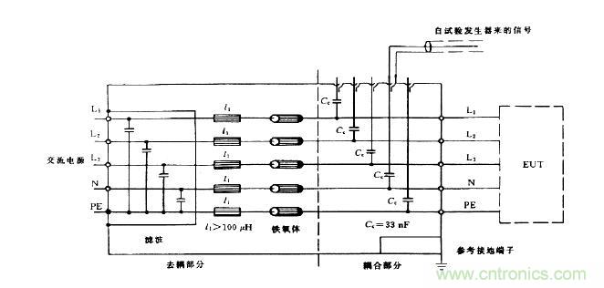 作為佐證,我們利用電源線耦合/去耦網絡來加以說明:在圖中可以看到從試驗發(fā)生器來的信號電纜芯線通過可供選擇的耦合電容加到相應的電源線(L1、L2、L3、N及PE)上,信號電纜的屏蔽層則和耦合/去耦網絡的機殼相連,機殼則接到參考接地端子上。這就表明脈沖群干擾實際上是加在電源線與參考地之間,因此加在電源線上的干擾是共模干擾。