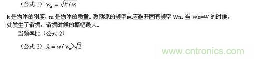頻率可分為固有頻率Wn和激勵(lì)頻率W,固有頻率源于產(chǎn)品的結(jié)構(gòu)特征,由質(zhì)量、質(zhì)量分布、質(zhì)心位置、剛度等多個(gè)因素和多個(gè)因素間的相互作用所確定。固有頻率計(jì)算公式為(公式1)k是物體的剛度,m是物體的質(zhì)量。激勵(lì)源的頻率點(diǎn)應(yīng)避開固有頻率Wn。當(dāng)Wn=W的時(shí)候,就發(fā)生了諧振,諧振時(shí)候的振幅最大。