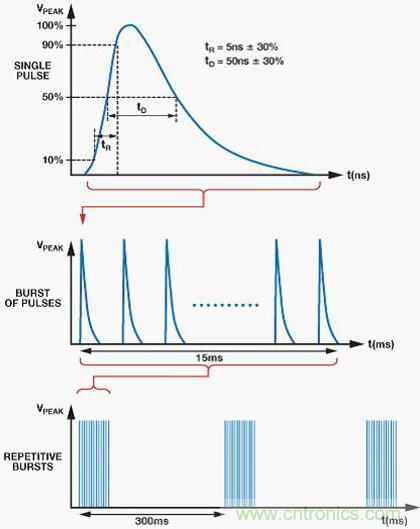 電快速瞬變測試要求將數(shù)個(gè)極端快速的瞬變脈沖耦合到信號線上,以代表容性耦合到通信端口的外部開關(guān)電路的瞬態(tài)干擾,這種干擾可能包括繼電器和開關(guān)觸點(diǎn)抖動(dòng),以及切換感性或容性負(fù)載引起的瞬變,所有這些在工業(yè)環(huán)境中非常常見。EC 61000-4-4中定義的EFT測試嘗試模擬因?yàn)檫@些類型的事件產(chǎn)生的干擾。