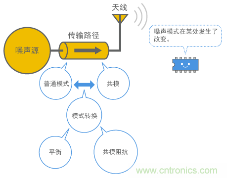 這可以理解為,當(dāng)噪聲傳輸路徑中電流出現(xiàn)輕微不平衡時,成分以共模的形式出現(xiàn)。