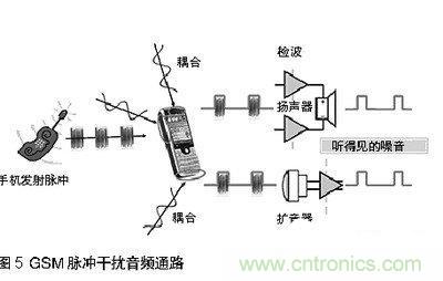 當(dāng)手機(jī)與基站通訊,或兩個(gè)手機(jī)彼此接近時(shí),發(fā)射脈沖通過擴(kuò)音器,揚(yáng)聲器,或頭戴式耳機(jī)線傳人音頻通路。見圖5。結(jié)果是音頻質(zhì)量大幅降低。