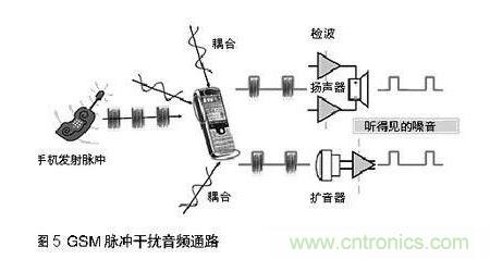 當手機與基站通訊,或兩個手機彼此接近時,發(fā)射脈沖通過擴音器,揚聲器,或頭戴式耳機線傳入音頻通路。見圖5,結果是音頻質(zhì)量大幅降低。