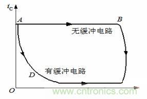 如圖所示增加吸收電路后開關(guān)管上的電流、電壓波形與沒有吸收回路時的波形比較。