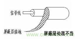 雙絞線、同軸電纜都能有效的抑制電磁干擾。在脈沖信號傳輸線路中常使用雙絞線,控制輔助電源線和傳感器信號線最好用雙絞屏蔽線。因為雙絞線兩根線之間有很小的回路面積,而且雙絞線的每兩個相鄰的回路上感應(yīng)出的電流具有大小相等、方向相反,產(chǎn)生的磁場相互抵消,這樣就可以減小因輻射引起的差模干擾,不過雙絞線絞合的圈數(shù)最好為偶數(shù),且每單位波長所絞合的圈數(shù)愈多,消除耦合的效果愈好。使用時注意雙絞線和同軸電纜兩端不能同時接地,只能單端接地,而對屏蔽線,屏蔽層兩端接地能既能屏蔽電場還能屏蔽磁場,單端接地只能屏蔽電場。使用同軸電纜時還要注意,其屏蔽層必須完全包覆信號線接地,即接頭與電纜屏蔽層必須3600搭接,才能有效屏蔽電磁場,如圖4所示,信號線裸露部分仍可以與外界形成互容耦合,降低屏蔽效能。