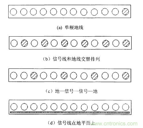 圖(c)的結(jié)構(gòu)也是每一個(gè)信號(hào)緊挨一個(gè)地線,也有很小的閉合環(huán)路面積,但因?yàn)閮蓚€(gè)信號(hào)導(dǎo)線共用一個(gè)地線,所以會(huì)有一些公共阻抗耦合,并且串?dāng)_要比圖(b)這種結(jié)構(gòu)要高。但在很多應(yīng)用中,這兩種結(jié)構(gòu)可以提供足夠的性能了。但美中不足的是,這兩種結(jié)構(gòu)所需導(dǎo)線太多,如在此產(chǎn)品中,激光頭連接器的信號(hào)線就有20根,如果采用這兩種結(jié)構(gòu)的話,就會(huì)需要30多根連接線。所以上面兩種結(jié)構(gòu)在此產(chǎn)品中未能得到采用。