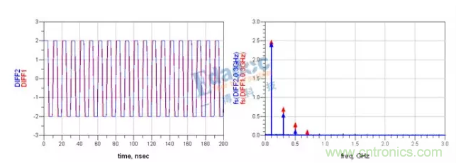 圖中,藍色的是N與P不等長的信號,可以看到,當(dāng)兩線不等長的時候,差分信號的能量明顯變?nèi)趿?,那多的能量去哪里了呢?/div>
