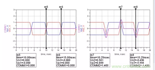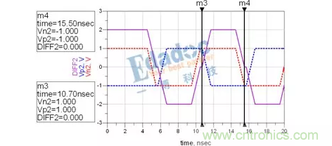可以看到,兩次經(jīng)過零軸的時間由之前的5ns變成了4.8ns?;蛘哒f,N與P的長度差,引起了0.04UI的抖動。這時候,串行的Clock recovery該花點心思才能將其時鐘解出來了。而且在進行時鐘與數(shù)據(jù)對位的時候,是對在0V這個階梯的左邊還是對在右邊呢?這又會引起時序問題的出現(xiàn)。