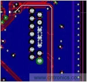 比如在EMC試驗(yàn)時(shí),MCU的ADC采集到的信號(hào)被干擾到了,則除了在原理圖上分析外,在PCB上講該信號(hào)高亮出來,然后再耐心尋找該信號(hào)的回流路徑是否有不順暢的地方: