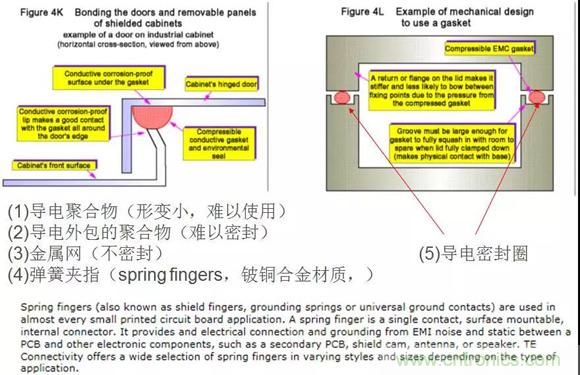 要達到40dB的SE,通常需要用導體墊圈、彈簧夾指來進行密封,注意內部元件與屏蔽罩的間距、數(shù)據(jù)總線與開孔和縫隙之間的距離。