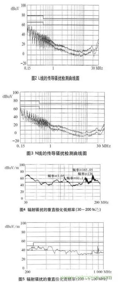 在3m法電波暗室對(duì)試驗(yàn)樣機(jī)進(jìn)行測(cè)試,其L、N線的傳導(dǎo)騷擾檢測(cè)曲線如圖2、3所示,輻射騷擾的垂直極化掃描曲線如圖4、5所示。
