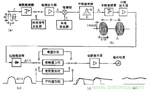 其電路結(jié)構(gòu)類似于半導體收音機。測量時先將測量儀調(diào)諧,對準某個頻率fi。該頻率經(jīng)高頻衰減器和高頻放大器后進人混頻器,與本地振蕩器的頻率fl混頻,產(chǎn)生很多混頻信號。經(jīng)過中頻濾波器以后僅得到中頻f0=fl-fi。中頻信號經(jīng)中頻衰減器、中頻放大器后,由包絡(luò)檢波器進行包絡(luò)檢波,濾去中頻得到其低頻包絡(luò)信號A(t)。A(t)再進一步進行加權(quán)檢波,加權(quán)可根據(jù)需要獲得A(t)的峰值(Peak)、有效值(rms)、平均值(Ave)或準峰值(QP),這些值經(jīng)低頻放大后可推動電表指示。測量前如果用校準信號發(fā)生器的信號進行預先校準, 則可以直接讀數(shù)。騷擾信號的讀數(shù)等效于正弦信號的有效植。