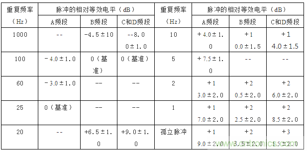 為了鑒別騷擾測量儀是否達到了表2規(guī)定的四大類指標,標準又進一步規(guī)定了騷擾測量儀的絕對脈沖特性和相對脈沖特性。所謂絕對脈沖特性指輸人規(guī)定的周期脈沖信號時騷擾測量儀的讀數(shù)應達到規(guī)定的值。絕對脈沖特性見表3。