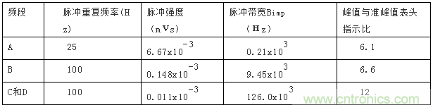 表3的含義是:在A、B、C、D各頻段內(nèi),分別輸入各自的標準周期脈沖,要求脈沖的幅度×寬度等于a(μVs),重復頻率為c(Hz),該周期脈沖的頻譜至少應該在b(MHz)以下是均勻的,脈沖信號發(fā)生器的源阻抗應和騷擾測量儀輸入阻抗相等。對于該輸人信號,騷擾測量儀在該頻段的任何頻率上的讀數(shù)都應該等于60dB(μV)。
