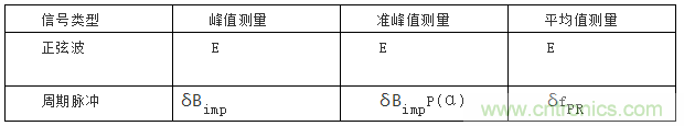 騷擾測量儀可以進行準峰值測量、峰值測量和平均值測量。當輸入信號是正弦波時,無論用何種方式測量,得到的讀數(shù)都是相同的,等于該正弦波的有效值,精度應優(yōu)于±2dB。但是如果輸入的是周期脈沖信號,則三種測量方法得到的讀數(shù)是不一樣的,其結(jié)果如表7所示。