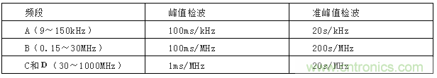 在準峰值測量時,如想要在某個頻率點得到較穩(wěn)定的測量值,則測量時間應大于檢波器充放電時間和電表機械時間常數(shù)之和,并且測量不止一個周期,所以一般準峰值測量時間要求比較長。如果測量儀具有掃頻測量功能,則設(shè)置的掃描時間應符合表9的規(guī)定。在實際測量中,往往先用峰值進行全頻段測量,然后再對超過限值的頻率點進行峰值測量,這樣可以大大節(jié)省測量時間。