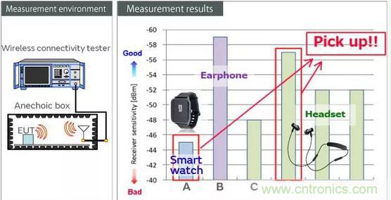在許多內(nèi)部耳機干擾的情況下,設(shè)備內(nèi)的不需要的無線電波疊加在通信所需的信號之上,這會產(chǎn)生噪聲并導(dǎo)致音頻跳過。在這里,我們使用商業(yè)產(chǎn)品來測量2.4 GHz信號的最小接收電平,以驗證由于設(shè)計對策而導(dǎo)致音頻跳過的可能性的差異,以防止藍牙設(shè)備內(nèi)的干擾。就內(nèi)部設(shè)備干擾而言,大圖值表示即使信號較弱也可以進行通信,并且音頻不太可能跳過。