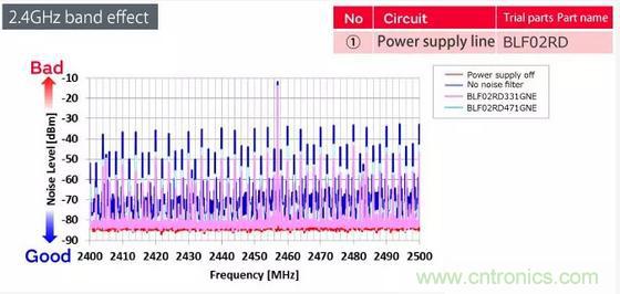 這些是在藍牙通信期間測量與天線耦合的噪聲頻譜的結(jié)果。將BLF02RD過濾器插入電源線。我們能夠?qū)⒄瓗г肼曁岣呒s5 dB,并驗證BLF02RD濾波器是一種有效的解決方案。