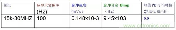 由表可知,峰值測量結(jié)果≥準(zhǔn)峰值測量結(jié)果。下表中中列出了輸入標(biāo)準(zhǔn)脈沖,在標(biāo)準(zhǔn)寬帶情況下峰值與準(zhǔn)峰值表頭指示之比值。峰值測量時(shí)的絕對(duì)脈沖特性