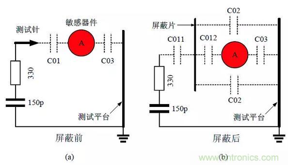 這里需要特別說明的是,對(duì)ESD 進(jìn)行靜電屏蔽防護(hù)的金屬屏蔽片是可以不需要接地的。經(jīng)屏蔽之后,在屏蔽片與大地之間就會(huì)增加一個(gè)分布電容C02,C02對(duì)C011 在C012、C03 產(chǎn)生的電壓起到分壓作用,因此,C02 與C012、C03 之比,越大越好,而C01=C011+C012=2C012(假說C011=C012)。加大C02 要盡量加大屏蔽片的有效面積,而減小C01,則應(yīng)該盡量讓A 遠(yuǎn)離測(cè)試探頭和機(jī)殼,并把敏感器件A 置于公共地的包圍圈之中。金屬屏蔽片一般選用如過濾嘴香煙包裝盒中的錫箔片最為簡(jiǎn)便。