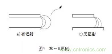 (1)20-H原則,決定印制線條間的距離,表述如下:所有的具有一定電壓的PCB都會(huì)向空間輻射電磁能量(如圖4a),為減小這個(gè)效應(yīng),PCB的物理尺寸都應(yīng)該比最靠近的接地板的物理尺寸小20H(其中H是兩層PCB的間距),即3mm左右,這樣可使輻射強(qiáng)度下降70%(如圖4b)。20-H原則示意圖如圖4所示: