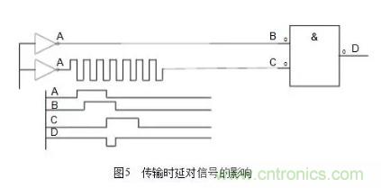 (3)保證信號(hào)在PCB上可靠的傳輸,確保信號(hào)的完整性。這里面主要的問題一般包括時(shí)延、阻抗不匹配、地彈跳、串音等。這不但影響到電子器件的穩(wěn)定工作,還會(huì)產(chǎn)生電磁干擾。一般在高速邏輯設(shè)計(jì)中最容易碰到時(shí)延問題,處理不好會(huì)產(chǎn)生不希望的脈沖干擾。傳輸時(shí)延對(duì)信號(hào)的影響如圖5所示。