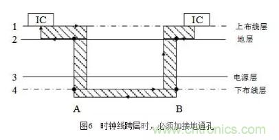 在布線時(shí)盡量少穿過孔,因?yàn)檫^孔阻抗和線阻抗不一樣,存在阻抗突變,從而產(chǎn)生駐波使信號(hào)變壞,容易形成輻射,尤其是在時(shí)鐘需要穿層時(shí),要做技術(shù)處理,時(shí)鐘線跨層時(shí)的處理如圖6所示。