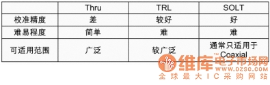 在三種常用的測試儀器中,網(wǎng)絡分析儀的校準方法最為嚴謹,頻譜分析儀次之,示波器的校準方法最為簡單。因此,我們這里主要討論網(wǎng)絡分析儀的校準方法。網(wǎng)絡分析儀常用的校準方法有三種,thru、trl和solt。三種方法的特性如表1所示。