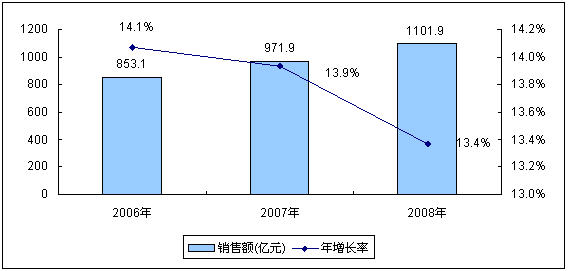 - 2008年銷售額達(dá)到1101.9億元,與2007年市場規(guī)模相比,增長13.4%