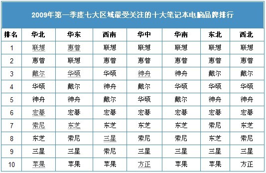 值得一提的宏碁,在上榜的品牌中,僅有宏碁的排名最為穩(wěn)定,七大區(qū)域的排名均位居第六??梢?jiàn),宏碁筆記本在市場(chǎng)中的用戶群較為穩(wěn)定。索尼、東芝、三星三大日韓系品牌在第七到第九的位置上爭(zhēng)奪,東芝在五大區(qū)域均勝出,索尼僅在華北、西北地區(qū)占據(jù)上風(fēng)。蘋(píng)果、方正在第十的位置上激戰(zhàn),兩大品牌的關(guān)注度較為接近,無(wú)論哪家都有取代另一家地位的可能。