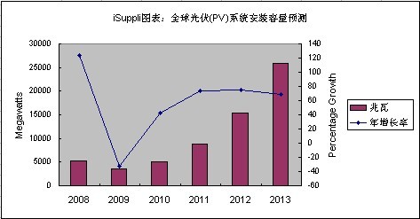 下圖所示為iSuppli公司對于全球光伏系統(tǒng)安裝容量的預(yù)測。