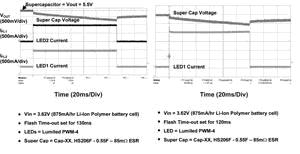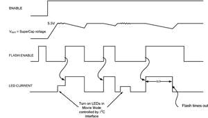 圖3顯示了采用2個以1A電流驅(qū)動的LED閃光燈和1個以2A電流驅(qū)動的LED閃光燈的測試結(jié)果。正如所見到的一樣,超級電容可以很容易地提供閃光持續(xù)120ms所需的電流,同時保持電源電壓充分地高于LED的VF電壓。在兩次閃光之間,超級電容以一個較慢的速率再充電,充電時間在外部設定,可針對不同的電池尺寸和化學原理進行優(yōu)化。圖4顯示了閃光功能和電影模式選項的數(shù)字控制。