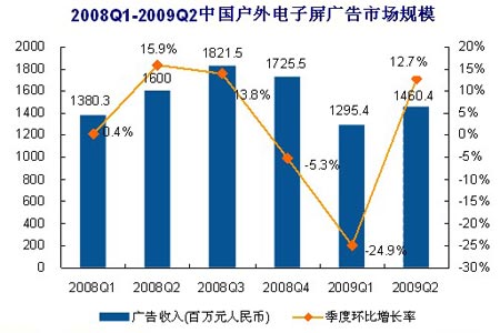 易觀國際分析認為,由于部分細分市場尚未走出宏觀經濟下滑的困境,加上整體市場的反彈并不強勁,因此本季度整體市場規(guī)模未達到去年同期的水平,預計目前中國宏觀經濟的好轉對戶外電子屏廣告市場的促進作用將在下半年顯現。