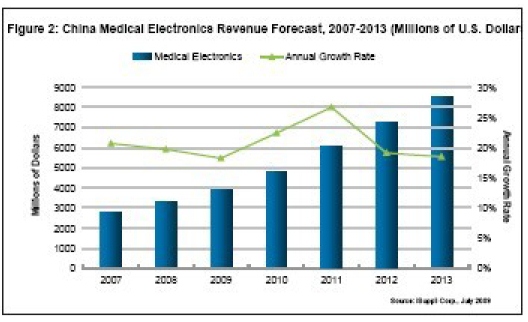 2009 年中國醫(yī)療電子設備銷售額將增長18.2%,從2008 年的33 億美元增長到39 億美元。未來幾年將保持這種強勁勢頭,復合年增長率將達21%,到2013 年上升到86 億美元。