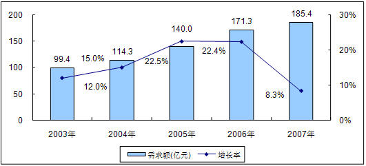 圖1 2004-2008年中國LED市場需求額