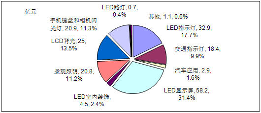 - LED顯示屏、LED指示燈、LCD背光以、手機(jī)鍵盤和相機(jī)閃光燈四大應(yīng)用領(lǐng)域市場需求額占整體市場的73.9%