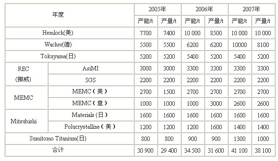 表1 2005-2007年國外硅材料企業(yè)的產(chǎn)能和產(chǎn)量情況