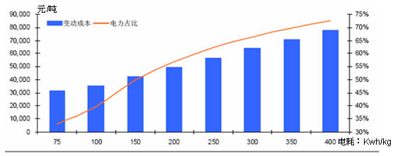 - 國內(nèi)企業(yè)在綜合電耗高的在300kWh/kg以上,電耗低的則在200kWh/kg左右