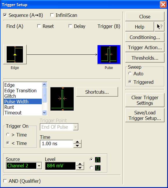 然而,當您回顧上一段的內容時就會發(fā)現(xiàn),當自動觸發(fā)發(fā)生時,它就意味著每次觸發(fā)之后,示波器進行重新準備時具有掛起時間。為了完全避免這一時間,示波器應改為“觸發(fā)(triggered)”模式。(這在某些示波器中稱為“正常”模式)。在“觸發(fā)(triggered)”模式中,除非發(fā)現(xiàn)觸發(fā)事件,否則示波器將不會進行觸發(fā)。因此,如果用戶將觸發(fā)模式設置為毛刺信號并且示波器一直沒有進行觸發(fā),那么用戶就可以確信毛刺信號沒有發(fā)生(至少示波器能夠檢測出)。