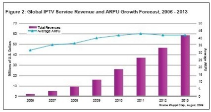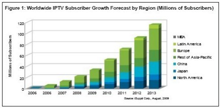 好消息是,在目前經(jīng)濟(jì)沉陷衰退之際,IPTV的好處已經(jīng)顯現(xiàn)出來。2008 年第四季度和2009 年第一季度,IPTV經(jīng)受住了經(jīng)濟(jì)衰退的沖擊,2009年有望增長 56%,用戶數(shù)量增到 3330萬個。2008年全球用戶數(shù)量是 2130萬。