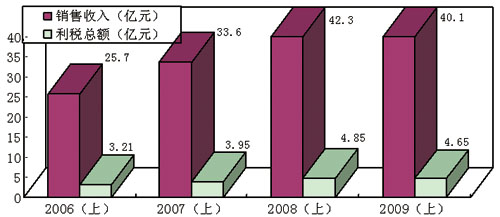 2006年上半年~2009年上半年銷售收入和利稅總額完成情況