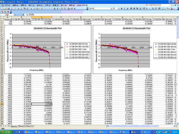 此外,在計(jì)量波特圖時(shí)需要對(duì)示波器每個(gè)檔位都進(jìn)行計(jì)量,最終產(chǎn)生的波特圖是所有檔位的結(jié)果疊加在一起的。波特圖的計(jì)量是需要半天時(shí)間完成的,并不是想象中那么輕松的工作。如圖8所示是力科SDA9000的波特圖,我特地將Excel中大量數(shù)據(jù)顯示給大家以使大家對(duì)校準(zhǔn)的嚴(yán)謹(jǐn)性有深刻認(rèn)識(shí)。 其垂直軸是-1dB/div, 疊加了10mv/div、20mv/div、50mv/div、200mv/div、500mv/div、1v/div等檔位的測(cè)試結(jié)果。 很多時(shí)候,我們的競(jìng)爭(zhēng)對(duì)手會(huì)把他們的波特圖畫成-10dB/div、只有一個(gè)檔位的測(cè)試結(jié)果拿給客戶,并和力科提供的這種-1dB/div、各種檔位疊在一起顯示的結(jié)果放在一起進(jìn)行對(duì)比,然后他們告訴客戶,他們的波特圖更平坦,更干凈,甚至將力科波特圖上面密密麻麻的點(diǎn)說(shuō)成是“噪音”大。這是有點(diǎn)貽笑天下的。 競(jìng)爭(zhēng)對(duì)手敢于一再采用這種做法,這是假設(shè)中國(guó)的工程師都沒有辨別力,獨(dú)立思考能力,是對(duì)工程師嚴(yán)重不尊重的公然欺騙行為。希望能引起大家注意。