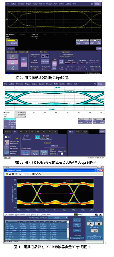 下面圖9是用力科采樣示波器WE100H測(cè)量的5Gbps眼圖,因?yàn)椴蓸邮静ㄆ鲙捀?,噪音小,A/D位數(shù)高,可作為周期重復(fù)性信號(hào)的眼圖測(cè)量的標(biāo)準(zhǔn)。 圖10是用力科SDA1100測(cè)量的5Gbps眼圖。 圖11是用其它品牌的12GHz示波器測(cè)量的5Gbps眼圖。一個(gè)有趣的現(xiàn)象是,12GHz帶寬測(cè)量的眼圖有“花生眼”出現(xiàn)。圖12可以一目了然揭示出“花生眼”產(chǎn)生的原因,5Gbps串行信號(hào)的三次諧波是7.5GHz,高斯響應(yīng)曲線在3次諧波處的衰減很大。