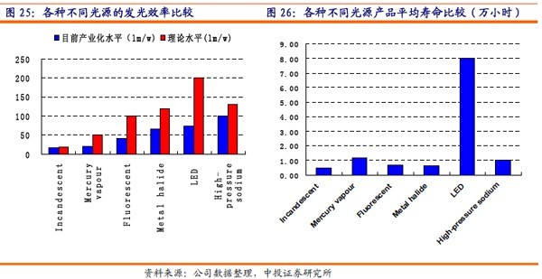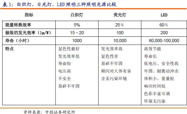 LED燈相對于其他光源有壽命長、發(fā)光效率提高空間大的優(yōu)勢,并且LED燈由于采用物理P-N結(jié)的冷發(fā)光原理,使得LED燈轉(zhuǎn)化效率高,也不存在汞燈污染源,被譽(yù)為綠色環(huán)保的照明能源并不為過。LED燈最高發(fā)光率為200流明/瓦,遠(yuǎn)高于其他的光源產(chǎn)品;其壽命理論值達(dá)到10萬小時(shí),遠(yuǎn)遠(yuǎn)高于其他光源產(chǎn)品。
