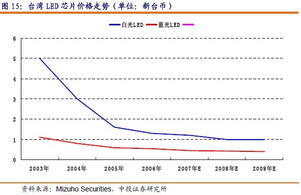 2004年臺灣廠商生產(chǎn)的藍(lán)光LED價(jià)格跌幅達(dá)到30%,2004年底藍(lán)光LED報(bào)價(jià)已跌至新臺幣0.60-0.80元,05年藍(lán)光LED的價(jià)格跌勢趨緩,全年跌幅在15%。預(yù)計(jì)08年全年跌幅在10%左右。