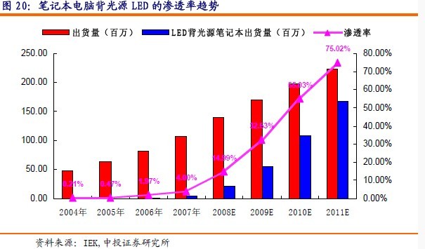 預(yù)計(jì)筆記本電腦的出貨量將從2004年的47.1百萬臺增長到2011年的223百萬臺,其中采用LED背光源的筆記本電腦將從2004年的0.1百萬臺增長到2011年的167百萬臺左右,滲透率2011年將達(dá)到75%左右,而在2004年滲透率只有0.2%。其中每部筆記本電腦用LED顆數(shù)是40-60個(gè)。
