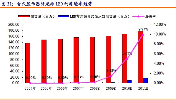 預(yù)計(jì)臺式顯示器的出貨量將從2007年的156.6百萬臺增長到2011年的177.5百萬臺,其中采用LED背光源的臺式顯示器將從2007年的0.2百萬臺增長到2011年的17.7百萬臺左右,滲透率從2007年的0.1%上升到2011年的10%左右。其中每臺顯示器用lLED數(shù)量為60個(gè)左右。